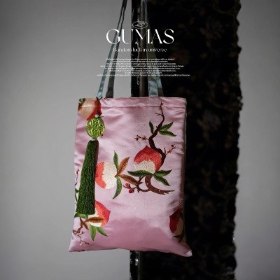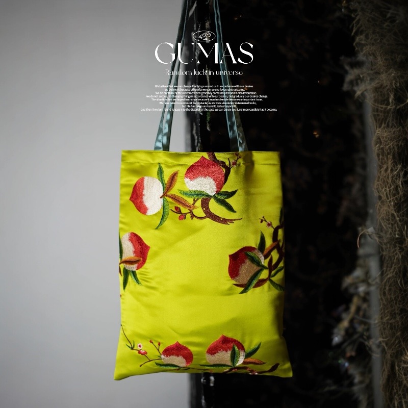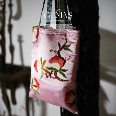 This silk embroidered tote is crafted from high-quality satin with a smooth, lustrous handfeel. The body features exquisitely stitched peach blossoms and fruit—symbols of good fortune and beauty—rendered in vivid yet refined colors. Blending meticulous craftsmanship with Eastern aesthetics, it is a lightweight, practical everyday bag that also carries artistic and collectible appeal. Whether for commuting, outings, or gifting, it showcases distinctive taste.