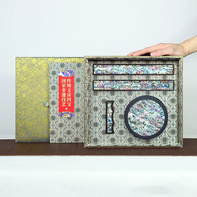This luxury scholar’s set is handcrafted through the combination of intangible-heritage shell inlay and traditional Song brocade techniques, each step meticulously refined by artisans. The iridescent abalone shell inlay reveals exquisite, shimmering patterns, while the Song brocade—renowned as the “Crown of Silks”—is elegant and resilient.