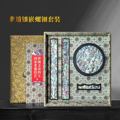 这款礼盒采用非遗螺钿镶嵌与传统宋锦工艺手工打造,每一道工序皆由匠人精细打磨。螺钿色泽斑斓,图案精致华美;宋锦典雅坚韧,被誉为“锦绣之冠”。工艺繁复、做工考究,不仅是实用雅致的文房佳品,更承载深厚的文化底蕴与艺术价值,具备极高的收藏与馈赠意义。