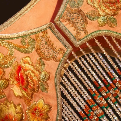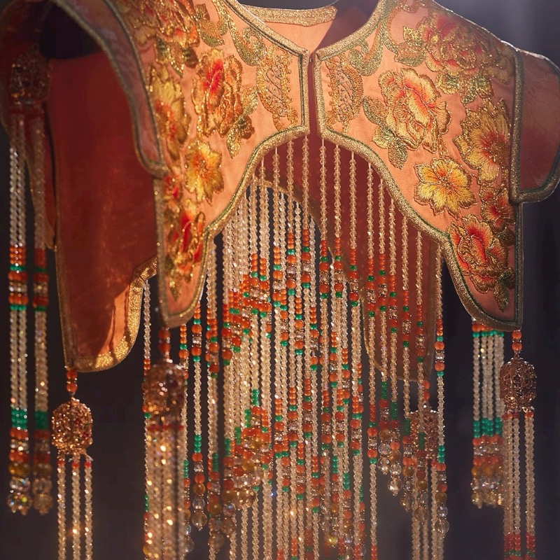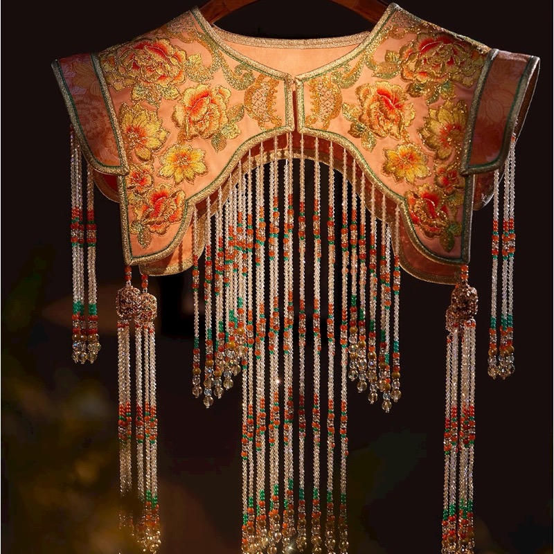 中国传统牡丹刺绣云肩,华丽珠串流苏摇曳生姿,尽显东方古典雅韵之美。
