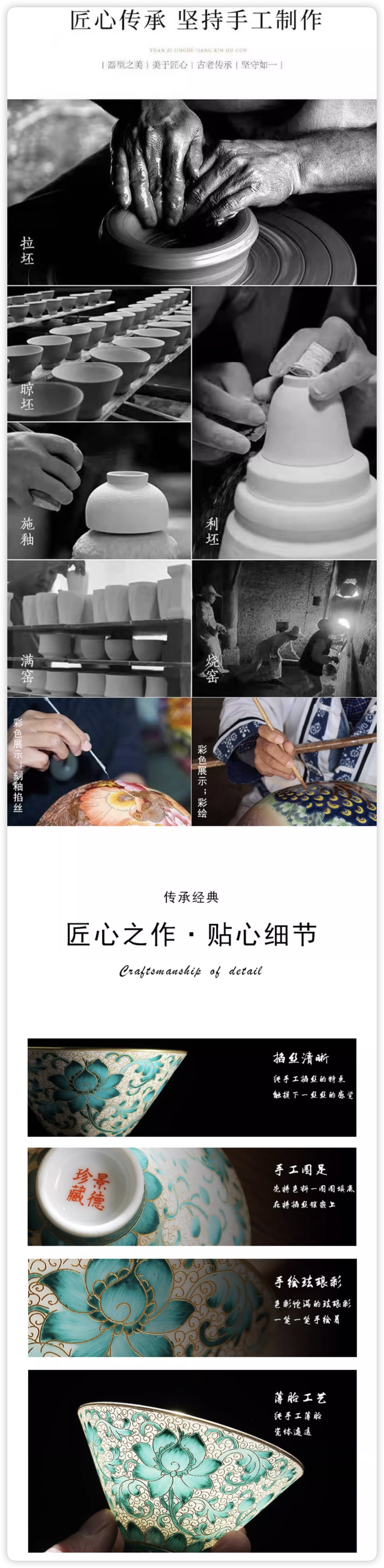 产品描述:坚持使用古法拉胚,手工掐丝及彩绘,薄胎工艺,磁体通透。这款手工珐琅彩茶杯,采用传统工艺精心绘制,色彩莹润细腻,花纹立体华美。杯体轻盈透亮,握感舒适,既适合日常品茗,又具收藏价值。东方雅韵与品质匠心兼具,是送礼与自用的上佳之选。