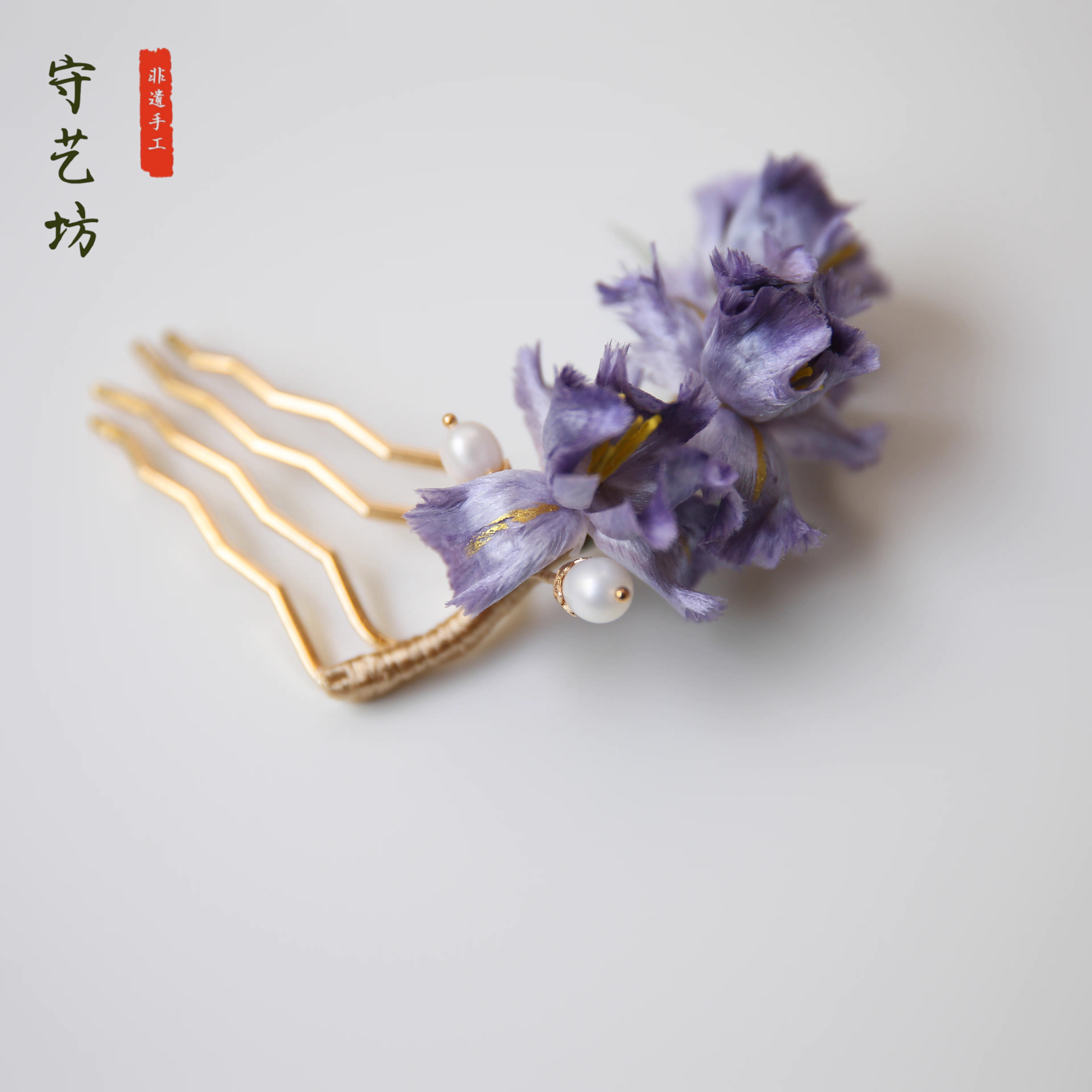 在花语与文化中,鸢尾象征信念、智慧、勇气与希望;在欧洲亦化作“百合花纹(Fleur-de-lis)”,寓意荣誉与高贵。它为新阶段送上祝福——心怀信念、勇敢向前。 适合毕业与晋升、求学启程、婚礼新娘、舞台与节庆佩戴或馈赠;以传统手工融合现代审美,为日常增添优雅与仪式感。 The Iris Ronghua Hair Ornament is the most elegant piece in our collection. Handcrafted with the traditional wrapping-and-binding technique, it arrives ready to wear—lightweight and comfortable, sculptural in layers, refined in color, and long-lasting.