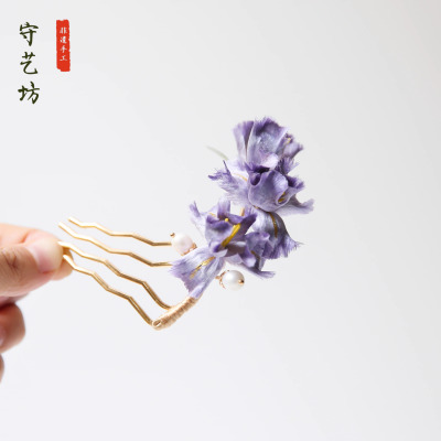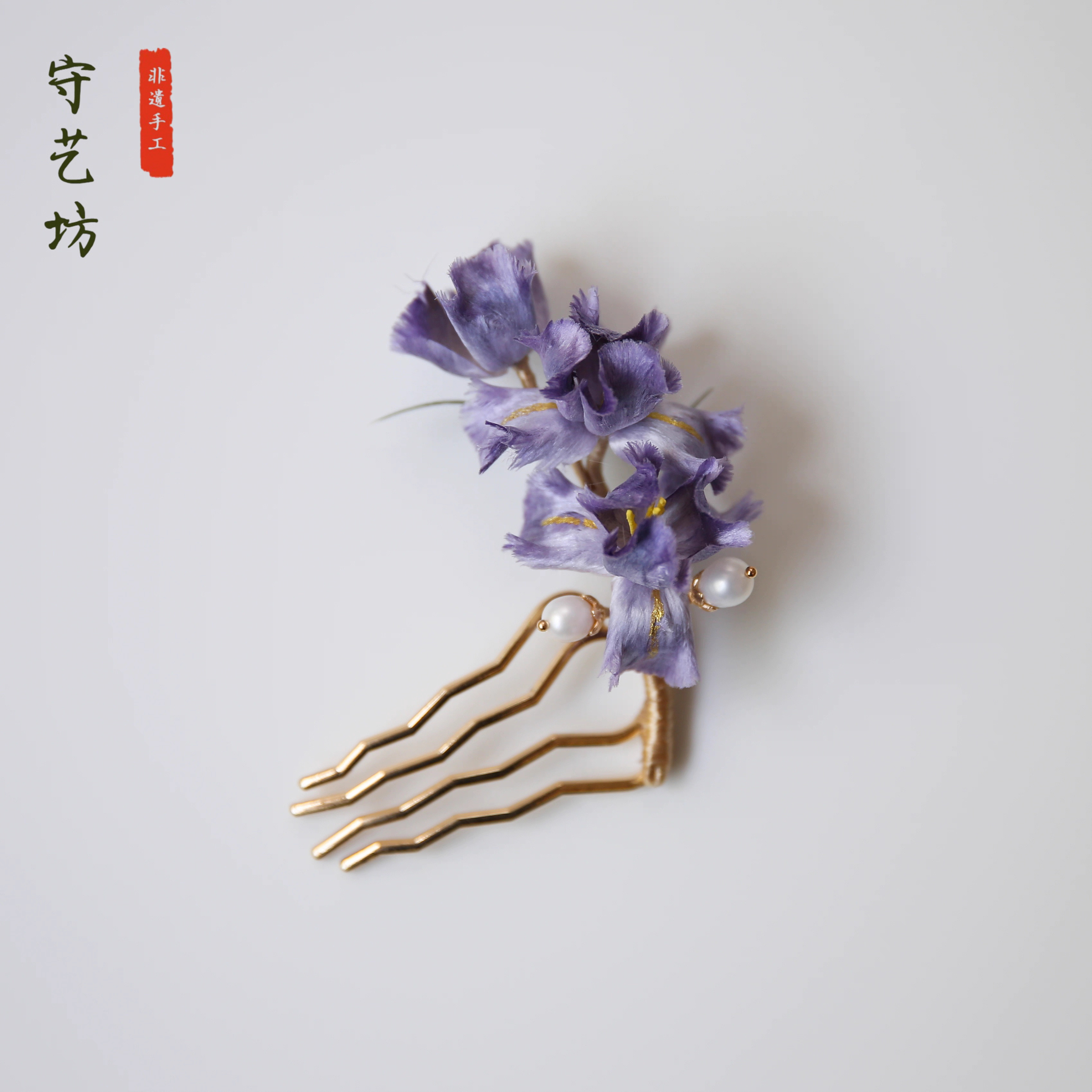 鸢尾花发饰绒花是我们系列中最优雅的一款。匠人以传统缠裹盘扎工艺手作成品,开盒即戴;轻盈贴发、层次立体、色泽雅致,久放不褪。